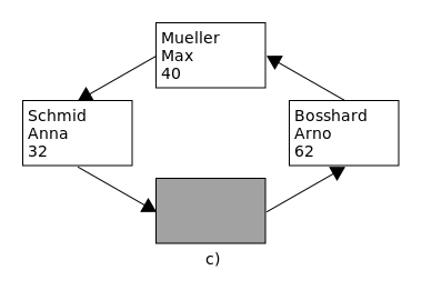 Die leere Liste besteht aus einem einzelnen Element, welches keine spezifische Person abspeichert und welches auf sich selbst zeigt (Abbildung 1 a). Dieses Element ist der Einstiegspunkt der Liste (auch Anker oder Wurzel genannt) und ist das einzige Element, das Sie im Programm direkt kennen und einer Variablen zuweisen. Dieses Element können Sie statisch allozieren (z.B. node_t anchor;, siehe Details weiter unten), denn es existiert während der gesamten Ausführungszeit. Alle anderen Elemente erreichen Sie ausgehend vom Anker, indem Sie einmal, den Pointern folgend, im Kreis herum gehen. Abbildung 1 b zeigt die Liste nach dem Einfügen der Person Max Mueller, 40 Jahre. Nach dem Einfügen von zwei weiteren Personen sieht die Datenstruktur aus wie in Abbildung 1 c. Das Entfernen der Person Arno Bosshard führt zu Abbildung 1 d.
