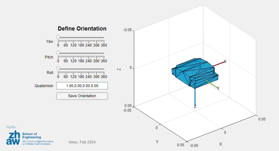 This app is mainly an orientation visualizer and editor. It can be used to find the correct orientation of a body and the corresponding quaternion. It is designed to work with the app trajectoryGenerationApp.m, but can be used as a standalone app as well.