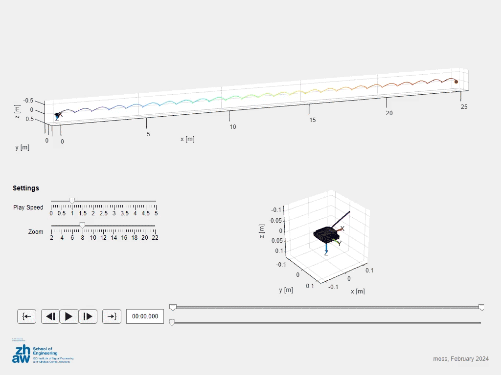This app is designed to visualize a Trajectory object either from the workspace or from the trajectoryGenerationApp. It provides a 3D plot of the trajectory, a zoomed in plot of the current position and orientation, and controls to play, pause, and skip through the trajectory.