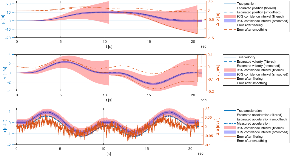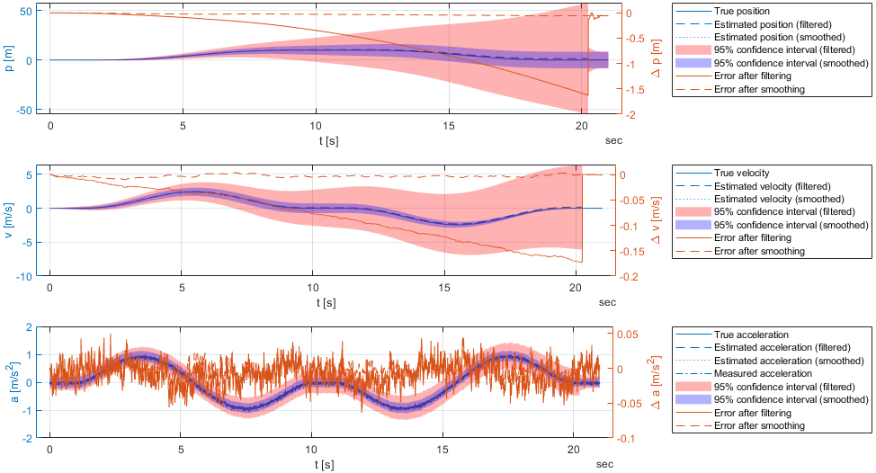 Also, we observe that the final confidence intervals have a constant bandwith around the estimated acceleration. This makes sense, since we're measuring acceleration. The confidence interval of the velocity, however, is larger the further the state is away from the velocity updates (i.e. the beginning and the end of the measurement series). Finally, the confidence interval of the position is constantly growing, which is also expected, since the position is the integral of the velocity and the position never gets updated.