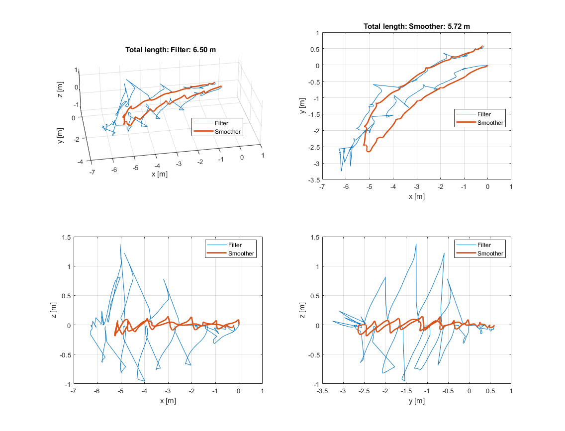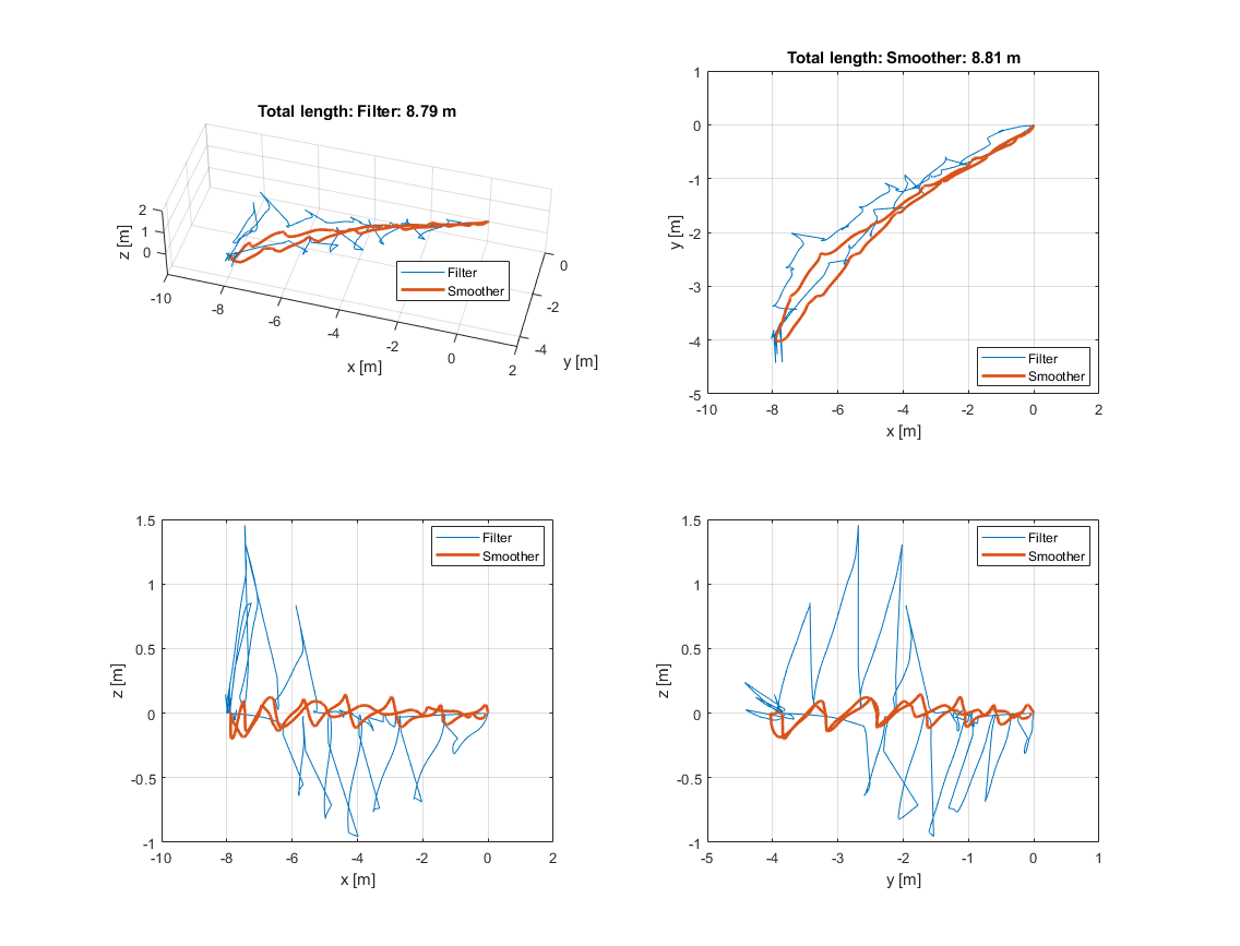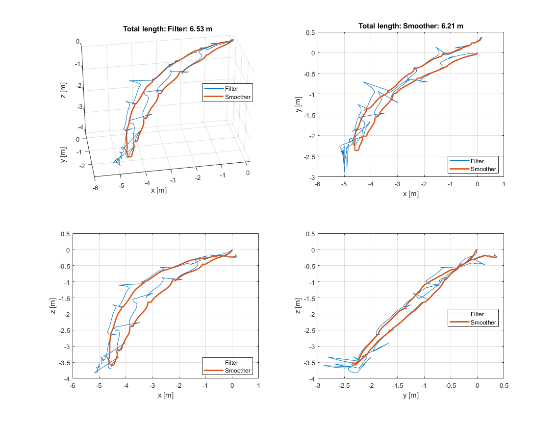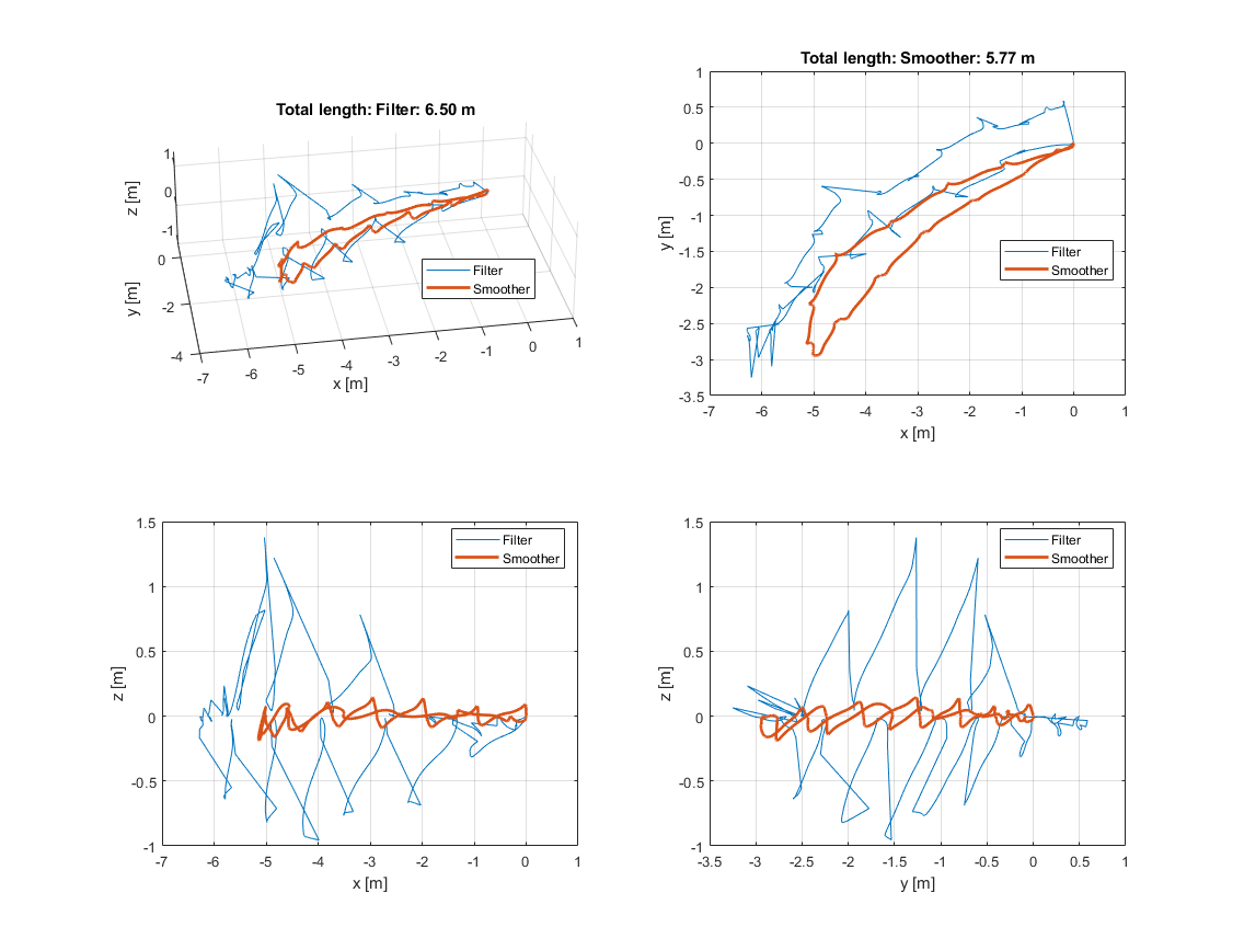 Now, the final position is only about 1 cm off the real position which is maybe even closer to the initial position than the final position was in real. The estimated total length of the trajectory is estimated to be 6.5 m and 5.77 m for the filter and smoother, respectively. Positive z-values are still present.