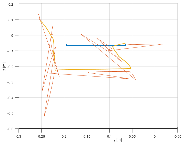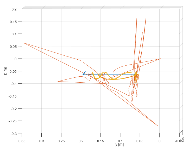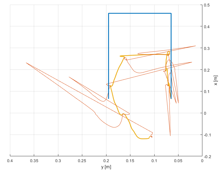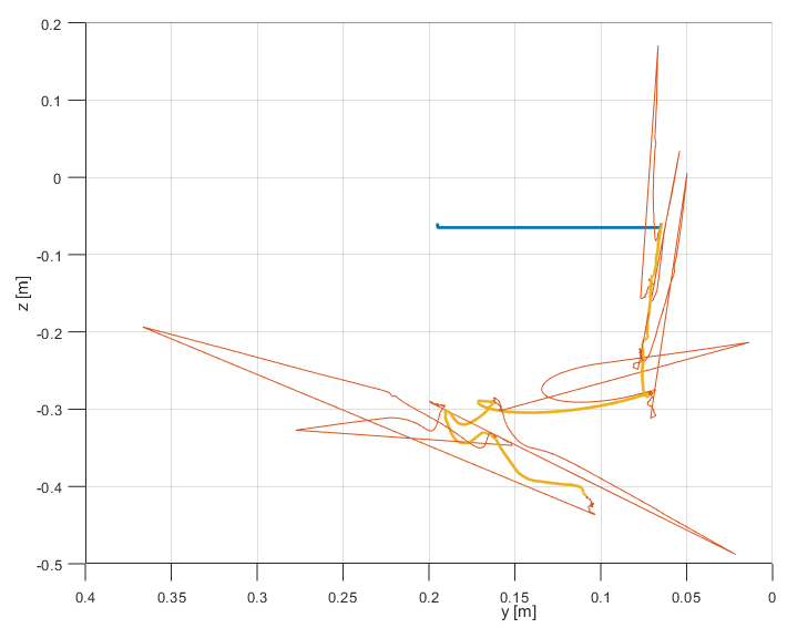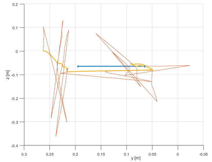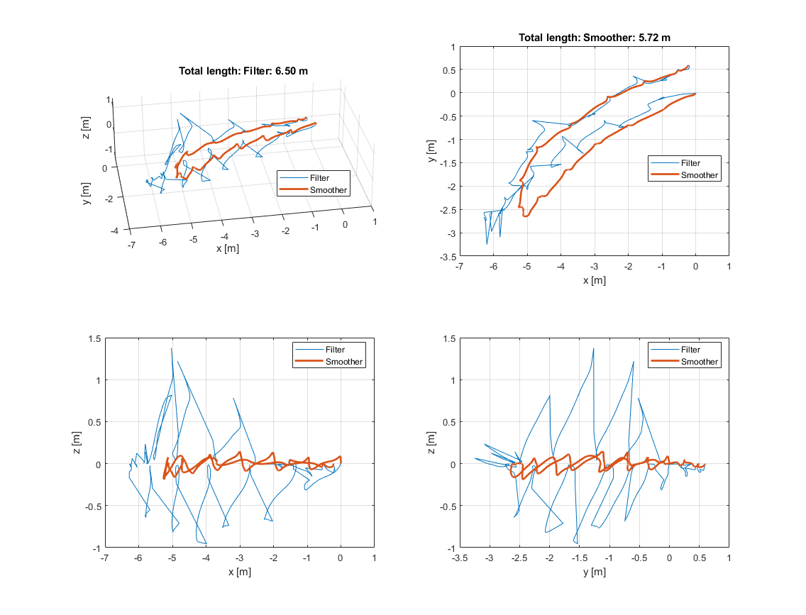 Now, the final position is only about 1 cm off the real position which is maybe even closer to the initial position than the final position was in real. The estimated total length of the trajectory is estimated to be 6.5 m and 5.77 m for the filter and smoother, respectively. Positive z-values are still present.