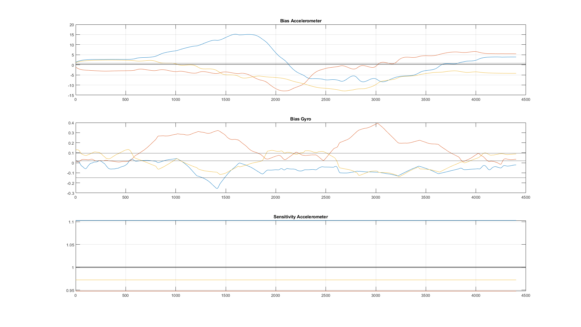 Even tough all this sounds very promising, when looking at the estimated biases and sensitivities, the results are not satisfying. The estimated biases and sensitivities are still far off the (likely) real values as you can see in the following plot. The estimated values are shown in blue, orange, and yellow for the x,y, and z-axis, respectively (smoother). The estimated values from the 6-faces calibration are shown in black.