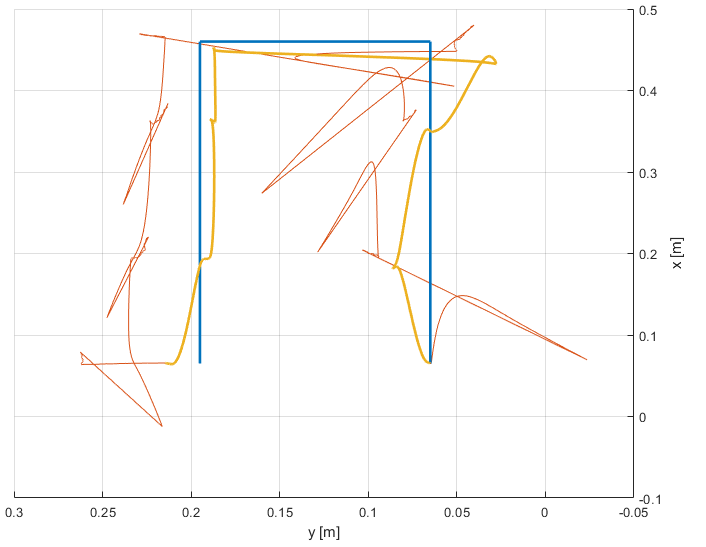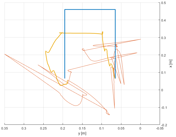 In the following plots, the real position is blue, the estimation based on the filter is orange, and the smoothed position estimation is yellow.